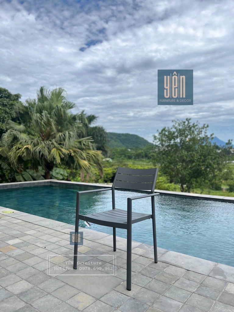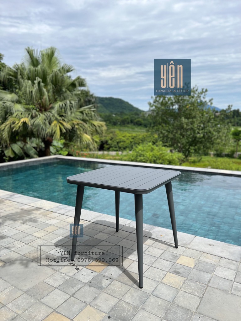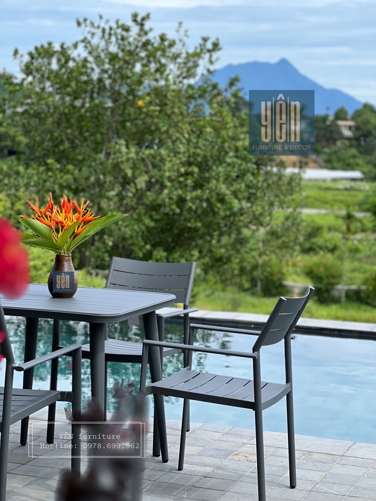 Khung nhôm được trau chuốt tỉ mỉ giúp bàn ghế không những không bị thô mà còn mang nét mạnh mẽ và cá tính. Bộ bàn ghế mang màu đen tuyền lạ mắt và sang trọng.