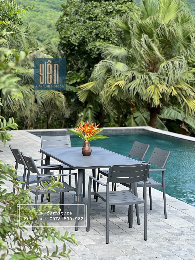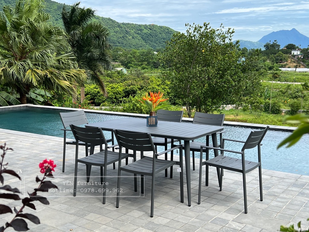Bộ bàn ghế ngoài trời GN01-06BCN1600 được thiết kế theo phong cách hiện đại, tối giản họa tiết. Ghế và bàn được tạo nên từ khung nhôm cứng cáp và vững chãi.