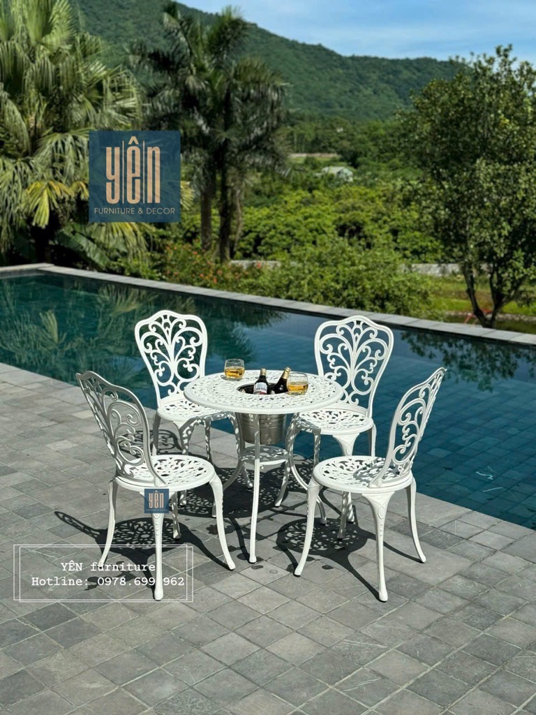 Bộ bàn ghế sân vườn ND01TM-04D700 là một bộ bàn ghế 4 chỗ ngồi được thiết kế từ nhôm đúc nguyên khối. Thiết kế dạng hoa văn cánh bướm của mặt bàn và khung ghế tạo nên sự thanh thoát, nhẹ nhàng. Nơi lý tưởng nhất để đặt bộ bàn ghế này là sân vườn hoặc ban công nhà bạn tận hưởng không khí trong lành, thưởng thức cafe hay ngắm những bình mình, hoàng hôn.