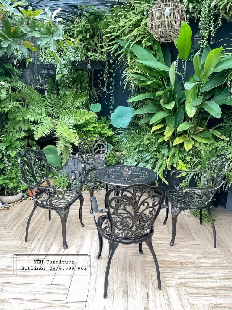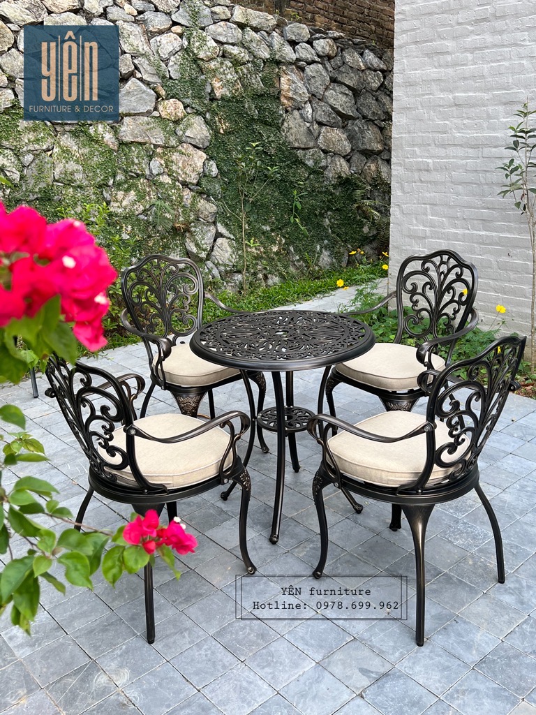 Bộ bàn ghế sân vườn ND02N-04D650 là một bộ bàn ghế 4 chỗ ngồi được thiết kế từ nhôm đúc. Thiết kế dạng hoa văn cánh bướm của mặt bàn và khung ghế tạo nên sự thanh thoát, nhẹ nhàng. Nơi lý tưởng nhất để đặt bộ bàn ghế này là sân vườn hoặc ban công nhà bạn tận hưởng không khí trong lành, thưởng thức cafe hay ngắm những bình mình, hoàng hôn.