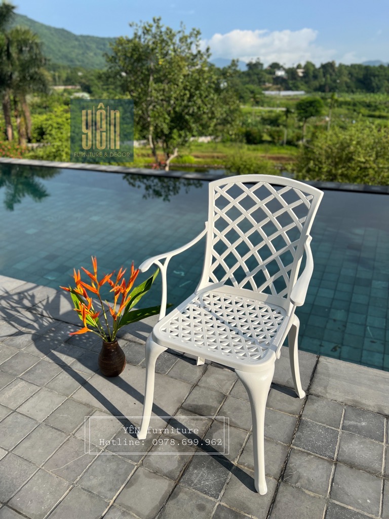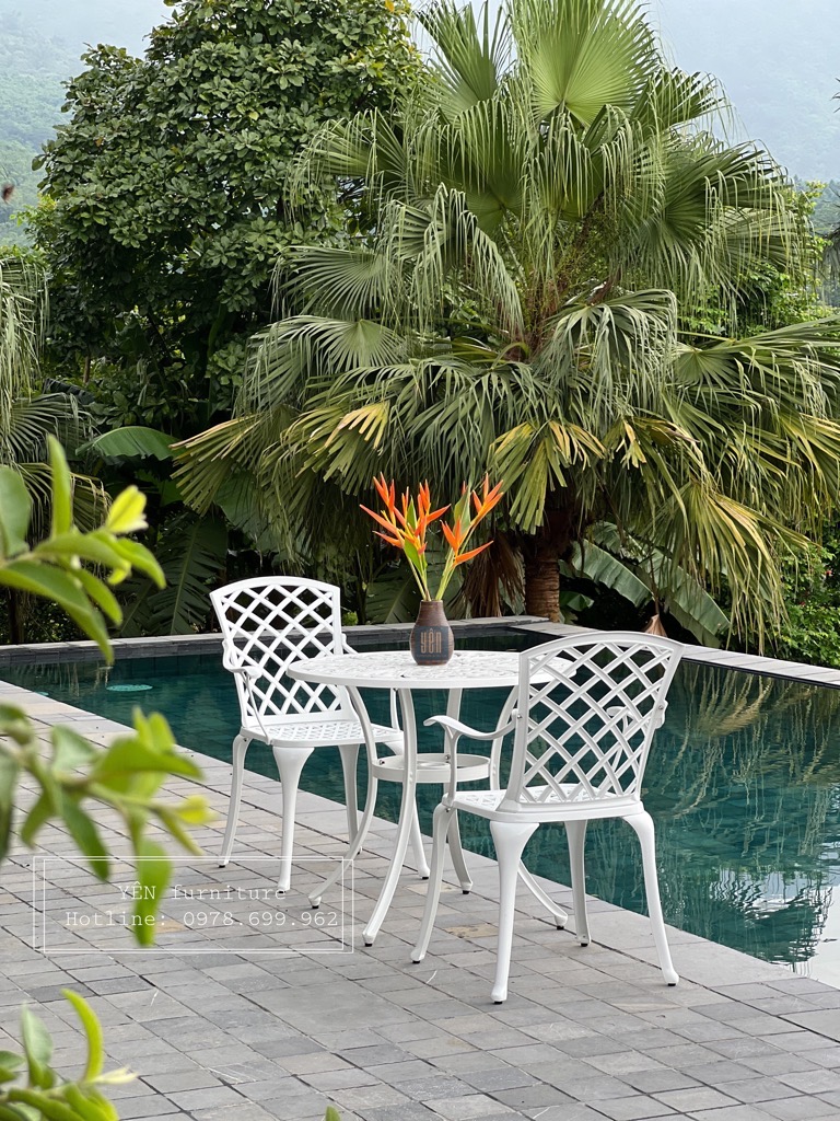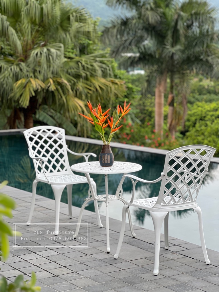 Bộ bàn ghế sân vườn ND08-04T/D850 là một trong những mẫu bản ghế được ưa chuộng nhất bởi lớp sơn trắng tạo nên sự sang trọng và thiết kế cổ điển. Được chế tạo bằng nhôm đúc nguyên khối khi sử dụng bộ sản phẩm này các bạn sẽ không cần phải bảo dưỡng, sản phẩm khó bị bảo mòn và hoen rỉ rất phù hợp cho ngoài trời, sân vườn nhà bạn.