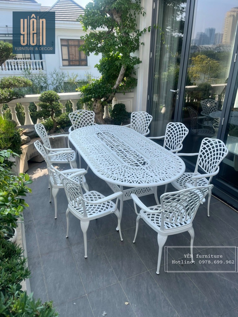 Bộ bàn ghế sân vườn ND04T-08OVAN2100 là một bộ bàn ghế 8 chỗ ngồi được thiết kế từ nhôm đúc nguyên khối. Với những thiết kế dạng lưới tinh sảo hoàn toàn phù hợp với với không gian ngoài trời và không gian sân vườn. Bộ bàn ghế ND04T-08OVAN2100 có 8 ghế có kích thước hoàn toàn phù hợp cho 1 bữa tiệc BBQ hay những bữa ăn gia đình.