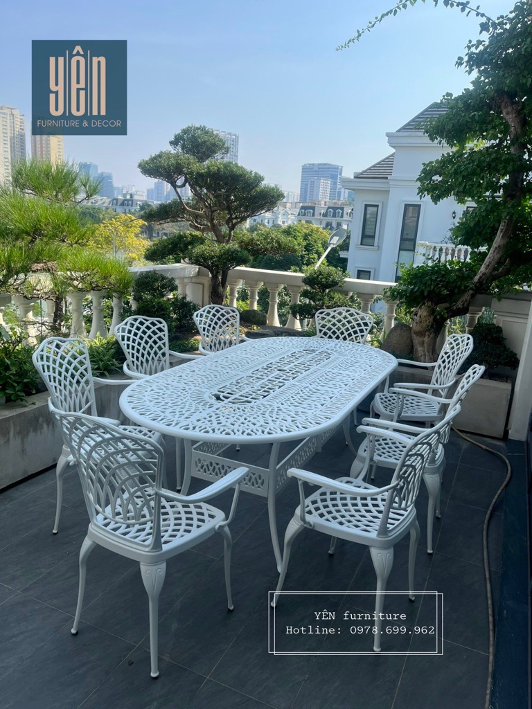 Bộ bàn ghế sân vườn ND04T-08OVAN2100 là một trong những mẫu bản ghế được ưa chuộng nhất bởi lớp sơn trắng tạo nên sự trang nhã và thiết kế cổ điển. Được chế tạo bằng nhôm đúc nguyên khối khi sử dụng bộ sản phẩm này các bạn sẽ không cần phải bảo dưỡng, sản phẩm khó bị bảo mòn và hoen rỉ rất phù hợp cho ngoài trời, sân vườn nhà bạn.