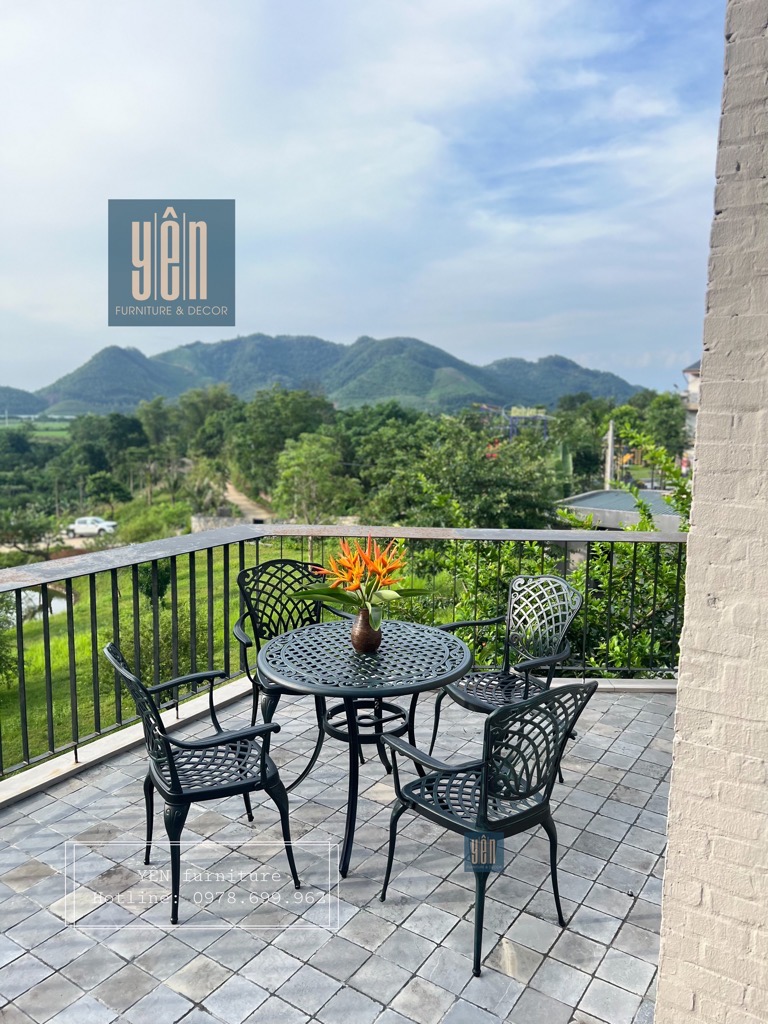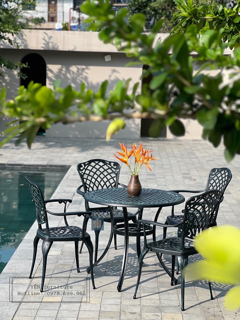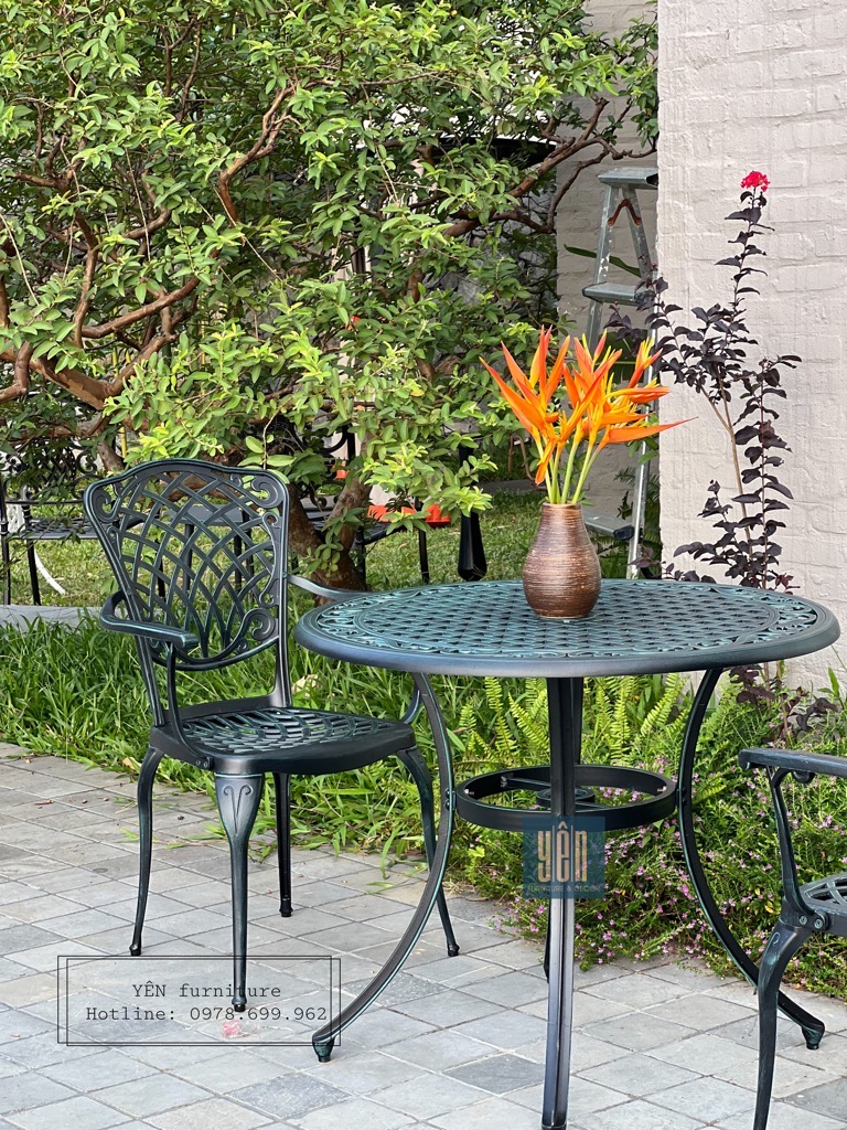 Bộ bàn ghế sân vườn ND06DG-04D900 là một trong những mẫu bản ghế được ưa chuộng nhất bởi lớp sơn màu xanh lá đậm độc lạ & tinh tế đi kèm thiết kế cổ điển. Được chế tạo bằng nhôm đúc khi sử dụng bộ sản phẩm này các bạn sẽ không cần phải bảo dưỡng, sản phẩm khó bị bảo mòn và hoen rỉ rất phù hợp cho ngoài trời, sân vườn nhà bạn.