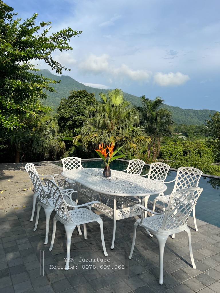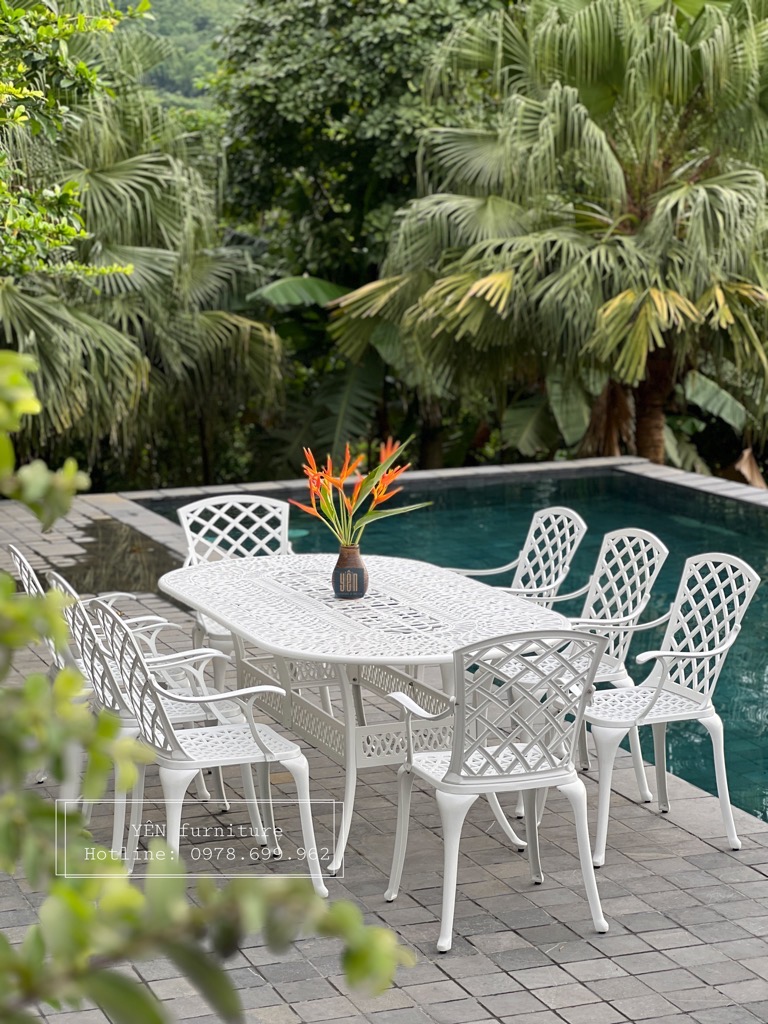Bộ bàn ghế sân vườn ND08T-08OVAN2100 là một trong những mẫu bản ghế được ưa chuộng nhất bởi lớp sơn trắng tạo nên sự trang nhã và thiết kế cổ điển. Được chế tạo bằng nhôm đúc nguyên khối khi sử dụng bộ sản phẩm này các bạn sẽ không cần phải bảo dưỡng, sản phẩm khó bị bảo mòn và hoen rỉ rất phù hợp cho ngoài trời, sân vườn nhà bạn.