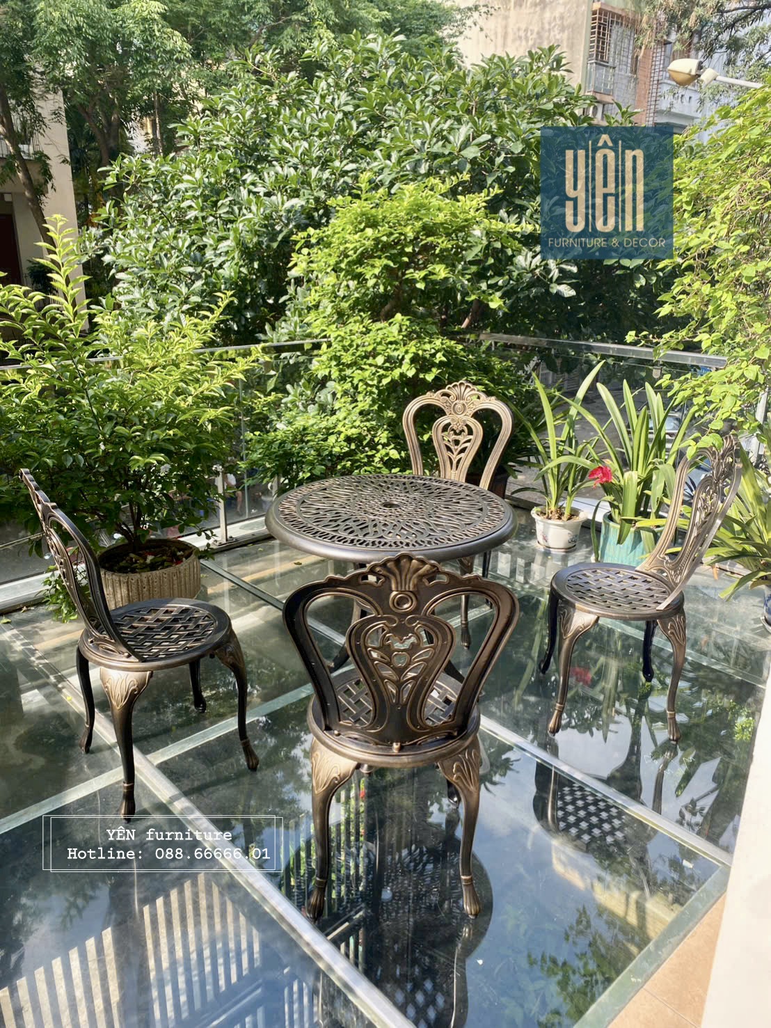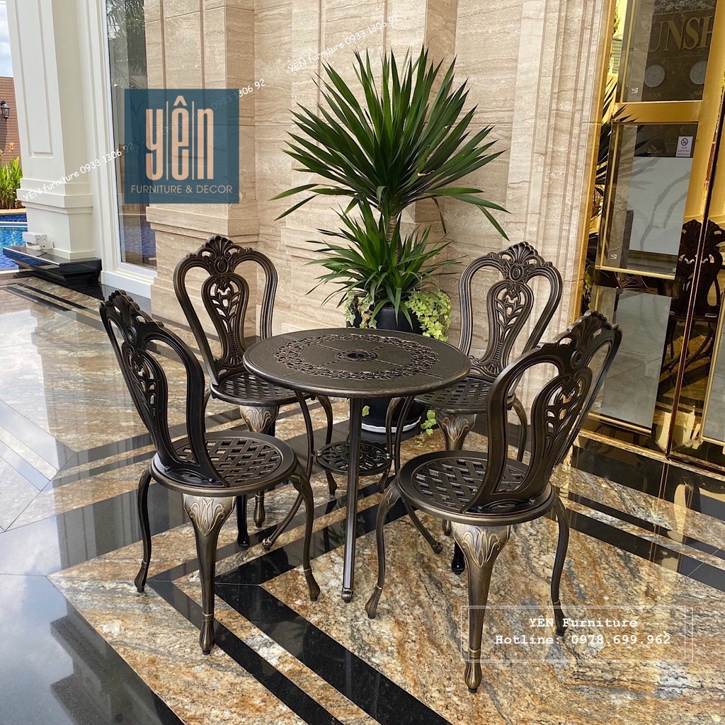 Bộ bàn tròn nhôm đúc mặt gồm 4 ghế này phù hợp cho không gian sân vườn, ban công quán cafe. Mặt bàn hoa văn thanh lịch nhưng không kém phần tinh tế. Dễ lau chùi, vệ sinh. Ghế nhôm lưng tựa hoa văn đẹp, khung xương chắc chắn. Chất liệu nhôm đúc không bị han gỉ. Bạn có thể an tâm trang trí bộ bàn ghế nhôm này cho quán của mình rồi nhé.