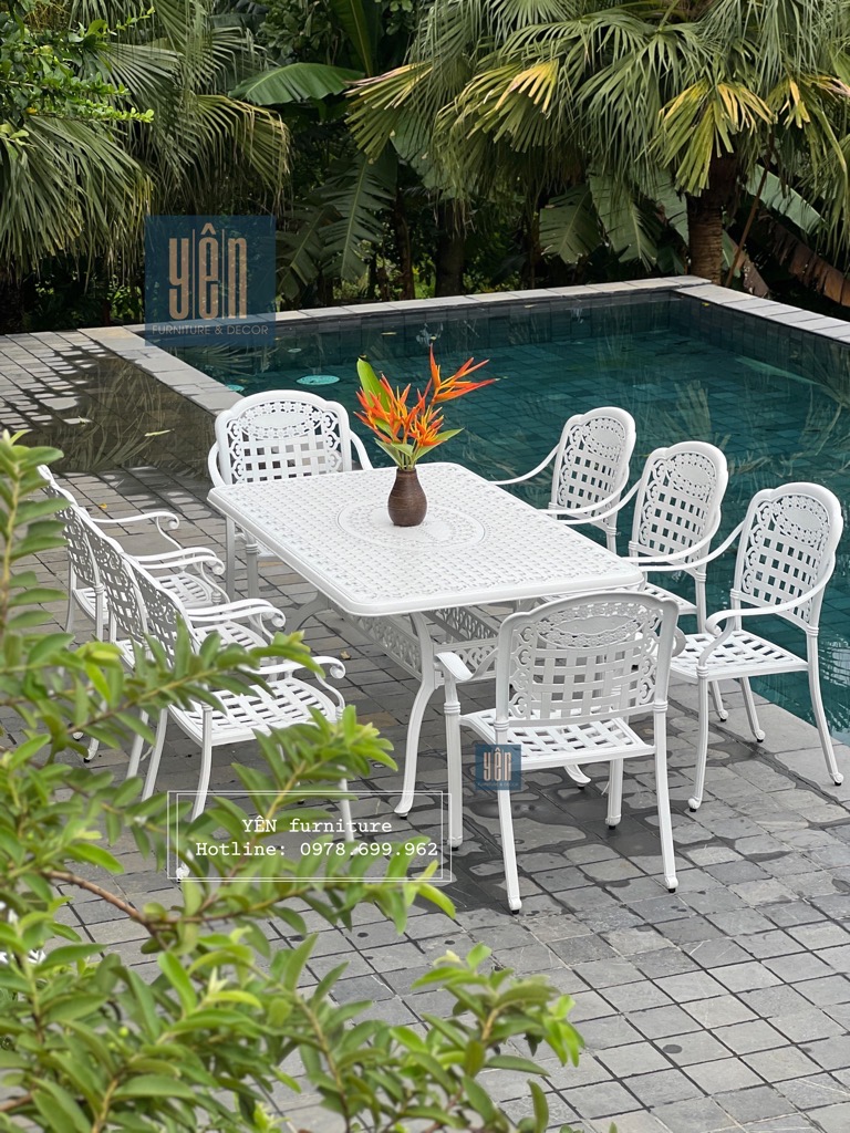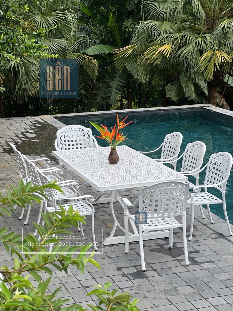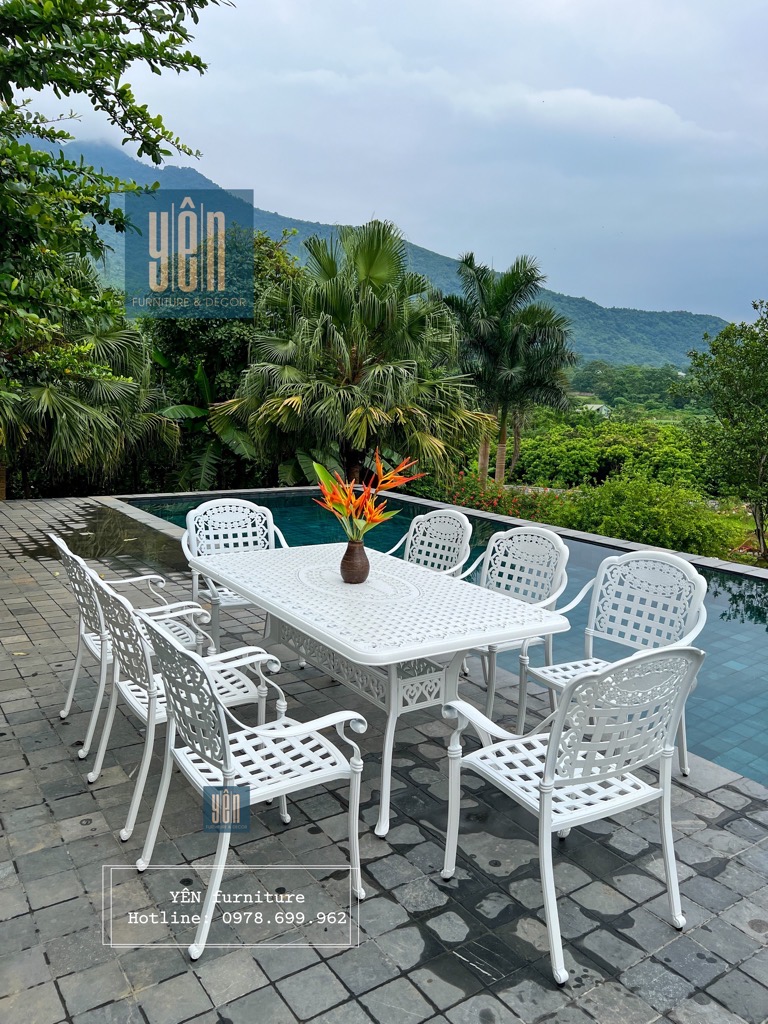 Là một trong những mặt hàng nhận được nhiều sự quan tâm của khách hàng bởi tính hiện đại, cổ điển trong thiết kế. Nó cũng sở hữu được nét đẹp tinh tế, nhẹ nhàng của thiết kế hoa văn nên khi sắp xếp ở bất kỳ không gian nào cũng có thể tôn lên được vẻ đẹp sang trọng vốn có. Mẫu bàn này có kích thước thoải mái nên nhiều người ứng dụng nó cho nhà hàng hoặc gia đình có nhiều người muốn sử dụng được thoải mái và rộng rãi hơn. Mời các bạn cùng Yên furniture tìm hiểu chi tiết về mẫu bàn ghế sân vườn này nhé.