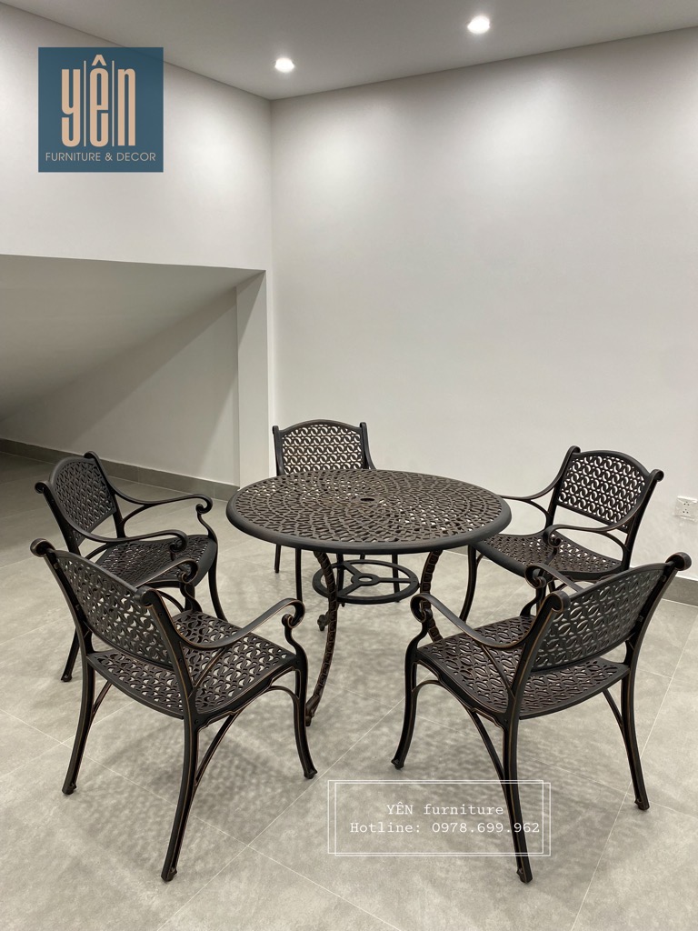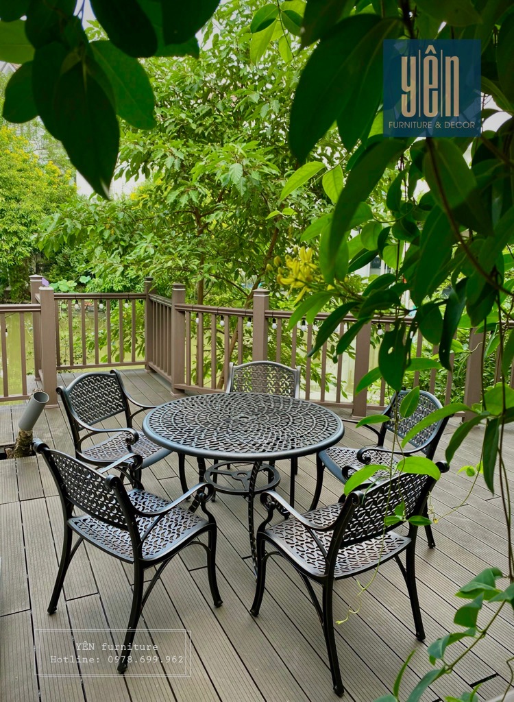 Bộ bàn ghế sân vườn với bàn tròn và 5 ghế là một yếu tố vô cùng quan trọng giúp sân vườn nhà bạn thêm phần sang trọng và lịch sự trong những buổi cafe, bữa tiệc ngoài trời với gia đình và bạn bè.