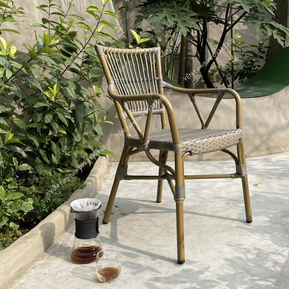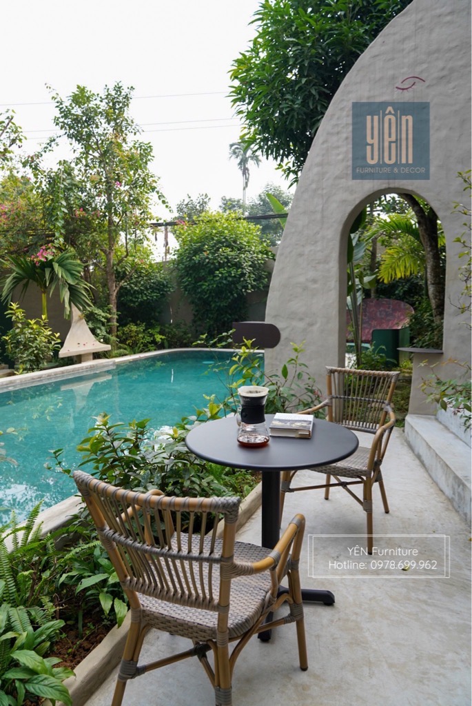 Mặt ngồi ghế được đệm bằng sợi nhựa giả mây cao cấp tạo cảm giác êm ái, chăm sóc cảm giác thư giãn của bạn. Tôn lên một không gian tuyệt vời sụ thư giãn của bạn.