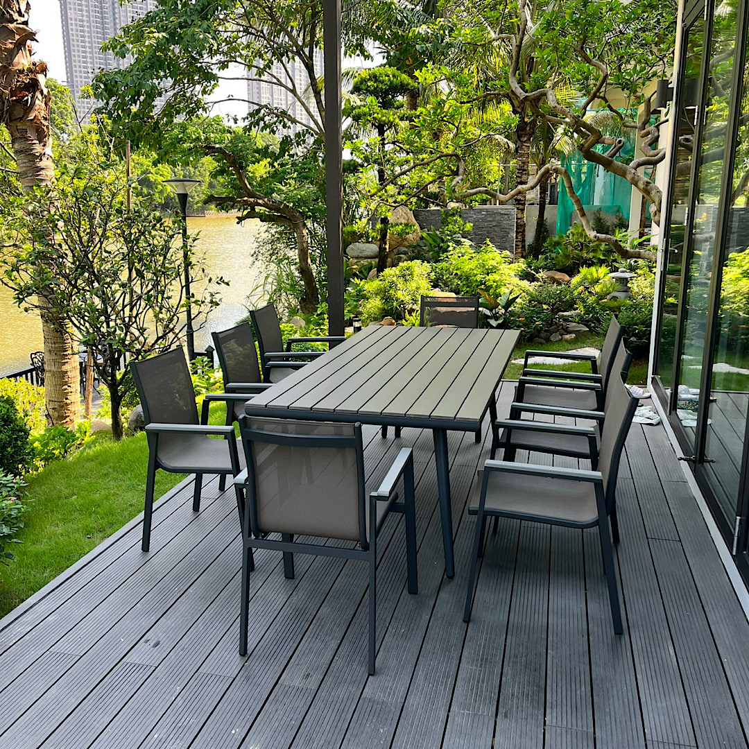 Ngoài ra,mặt bàn làm từ chất liệu Polywood – là một vật liệu nhựa tổng hợp cao cấp thay thế gỗ trong môi trường người trời, chống mối mọt, cong vênh và độ chịu nhiệt cao.