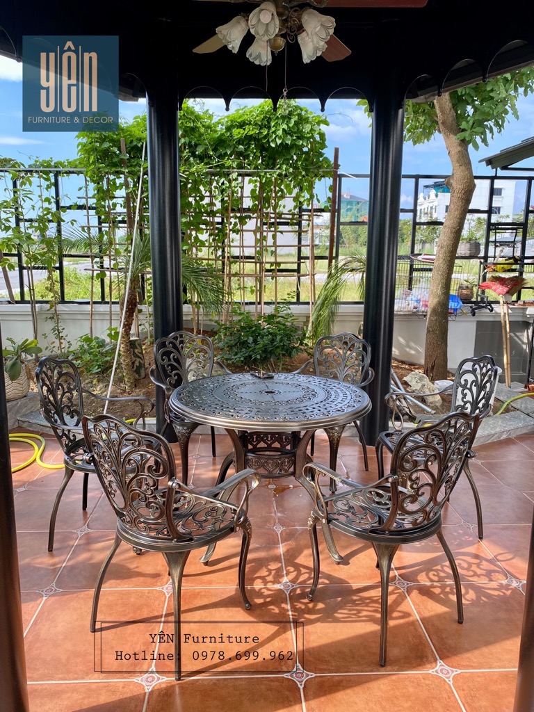 Bàn được thiết kế họa tiết những họa tiết vô cùng tinh tế, tỉ mỉ tạo thành những hoa văn sống động, tạo sự nổi bật cho bộ bàn ghế khi đặt trong sân vườn, không gian ngoài trời.
