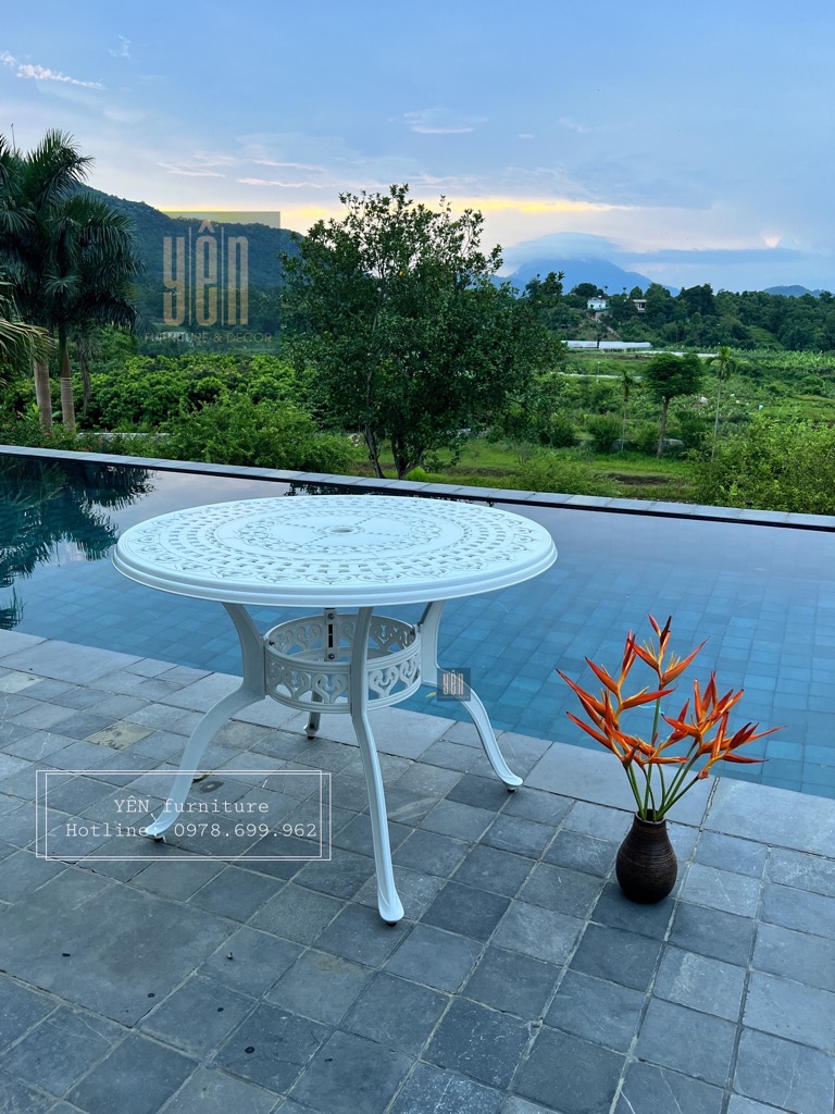 Bàn được thiết kế họa tiết những họa tiết vô cùng tinh tế, tỉ mỉ tạo thành những hoa văn sống động, tạo sự nổi bật cho bộ bàn ghế khi đặt trong sân vườn, không gian ngoài trời.