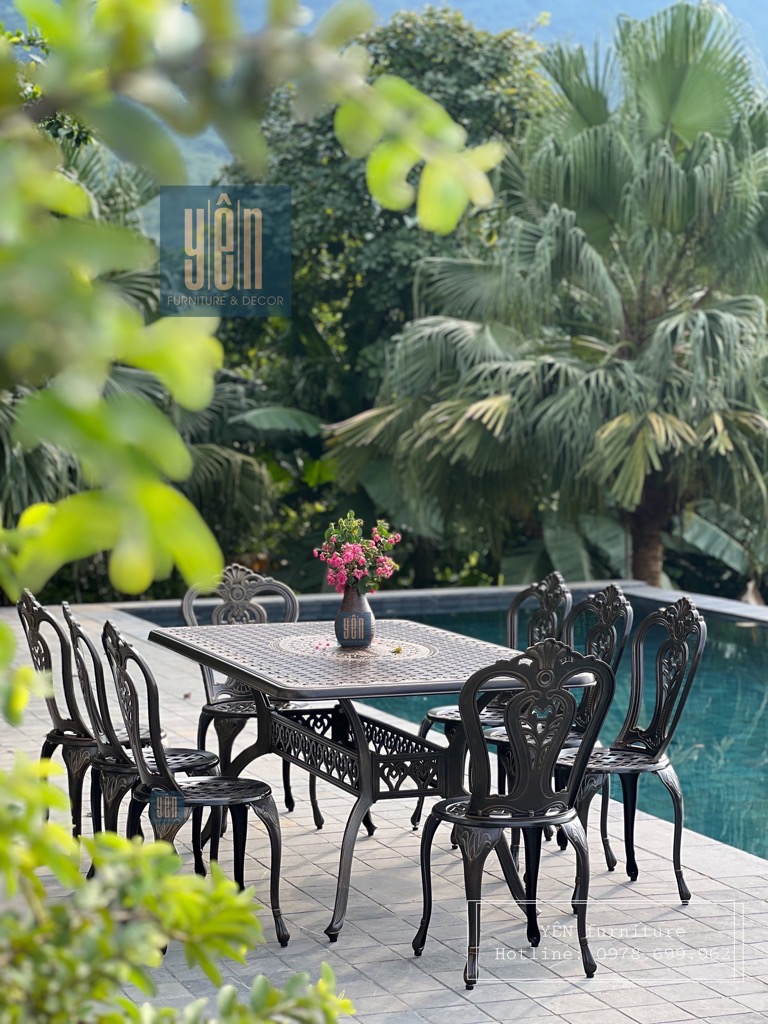Bàn được thiết kế họa tiết những họa tiết vô cùng tinh tế, tỉ mỉ tạo thành những hoa văn sống động, tạo sự nổi bật cho bộ bàn ghế khi đặt trong sân vườn, không gian ngoài trời.
