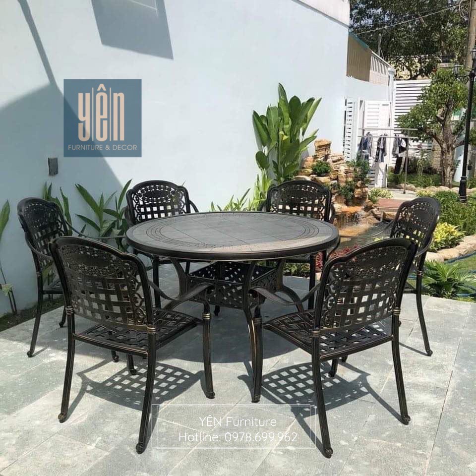 Bộ bàn ăn nhôm đúc cao cấp phong cách tân cổ điển là sự kết hợp hoàn hảo giữa vẻ đẹp sang trọng và lịch lãm. Hoa văn tinh tế, chất liệu nhôm bền bỉ, sang trọng, bộ bàn này sẽ trở thành điểm nhấn thu hút sự chú ý của khách hàng đối với ngoại thất sân vườn của mình. Bằng chất liệu nhôm đúc chắc chắn, sản phẩm đảm bảo sự an toàn và độ bền cao trong mọi điều kiện thời tiết.