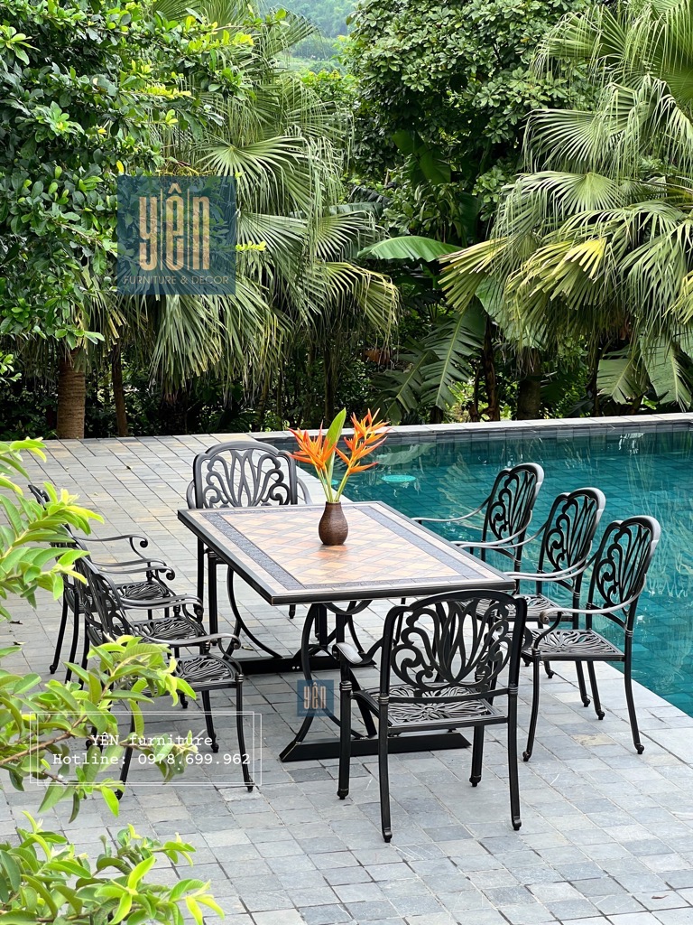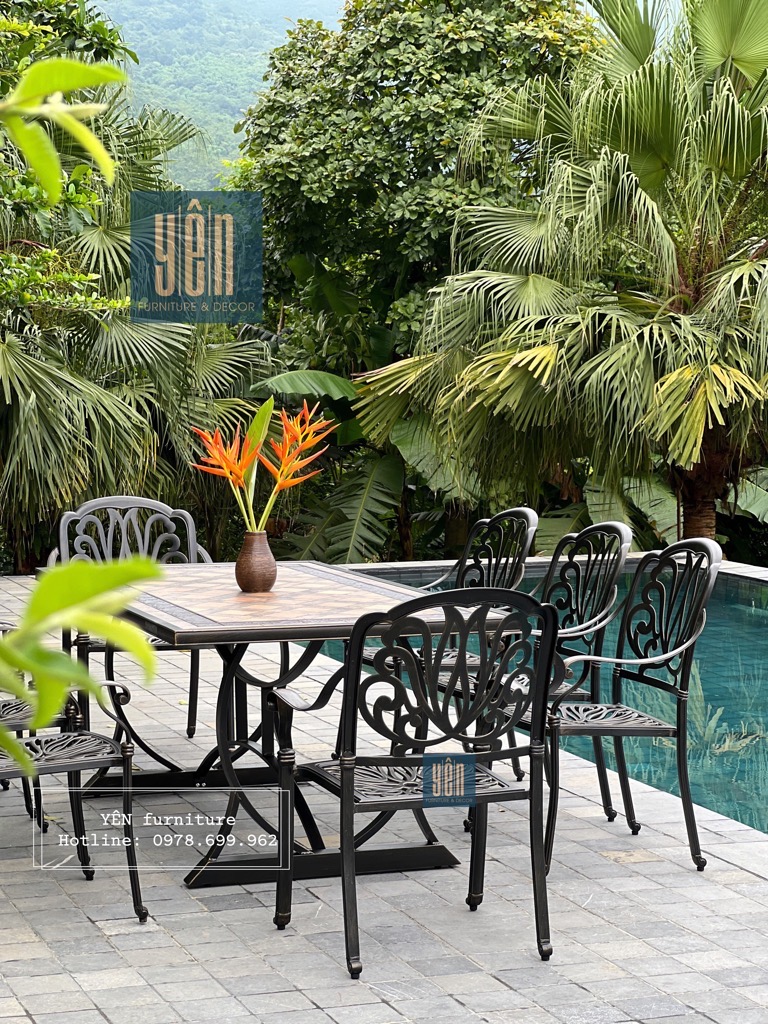 Bàn được thiết kế họa tiết những họa tiết vô cùng tinh tế, tỉ mỉ tạo thành những hoa văn sống động, tạo sự nổi bật cho bộ bàn ghế khi đặt trong sân vườn, không gian ngoài trời.