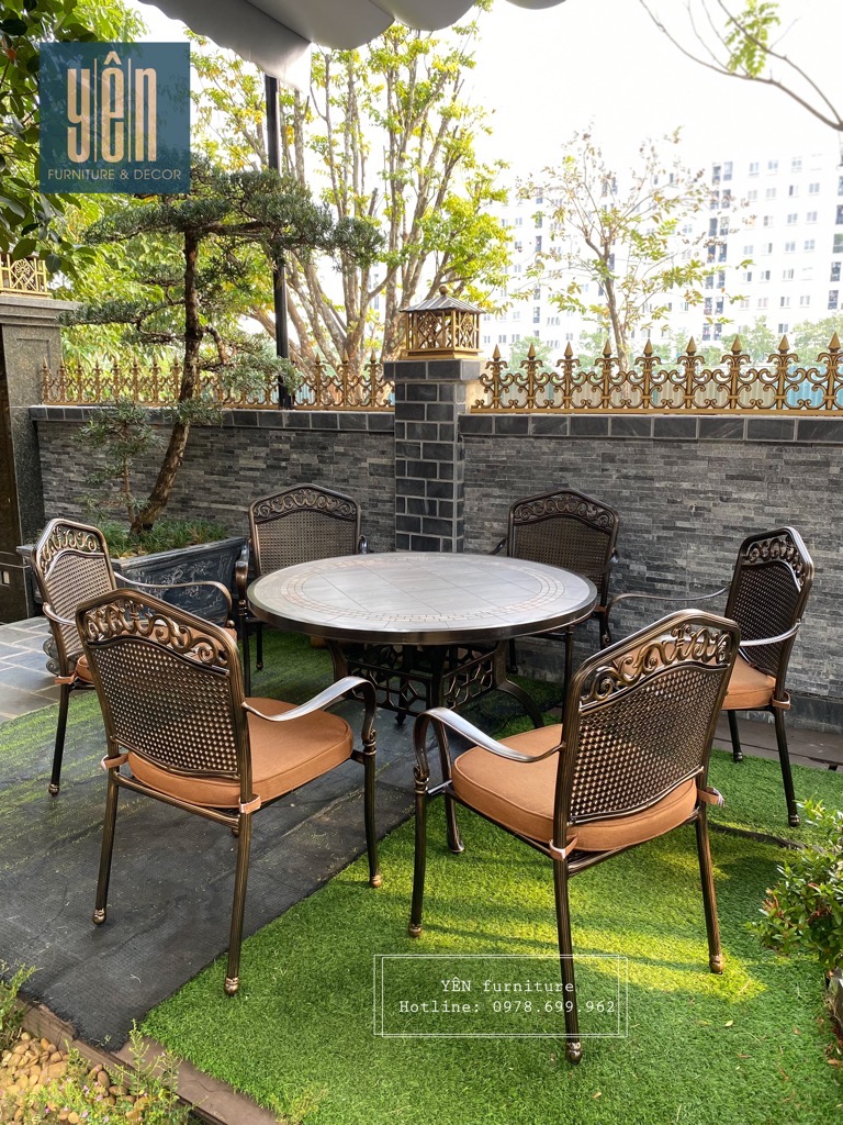 Bộ bàn ghế sân vườn ND21-06D1200 là một trong những mẫu bản ghế được ưa chuộng nhất bởi lớp sơn nâu tạo nên sự huyền bí, sang trọng và thiết kế cổ điển. Được chế tạo bằng nhôm đúc nguyên khối khi sử dụng bộ sản phẩm này các bạn sẽ không cần phải bảo dưỡng, sản phẩm khó bị bảo mòn và hoen rỉ rất phù hợp cho ngoài trời, sân vườn nhà bạn.